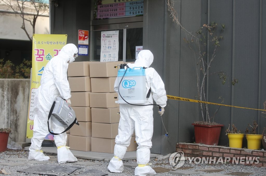 | ▲ Health workers conduct disinfection work around a religious educational facility in Gwangju, about 330 kilometers south of Seoul, on Jan. 27, 2021. (Yonhap) |