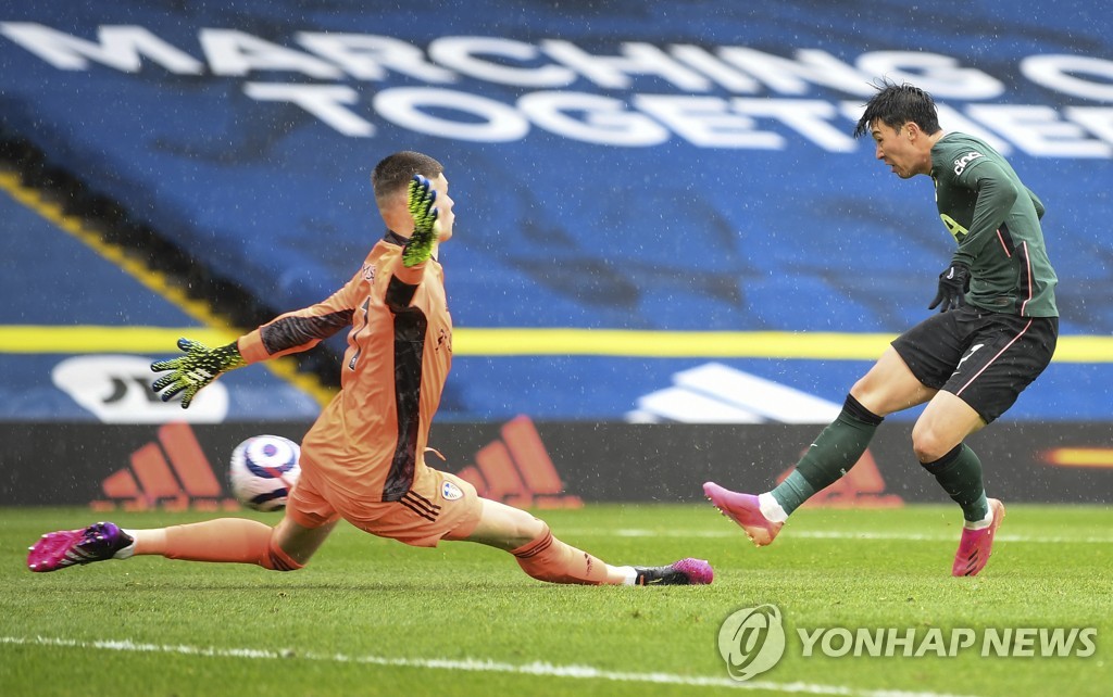 | ▲ In this Associated Press photo, Son Heung-min of Tottenham Hotspur (R) scores past Leeds United goalkeeper Illan Meslier during a Premier League match at Elland Road in Leeds, England, on May 8, 2021. (Yonhap) |