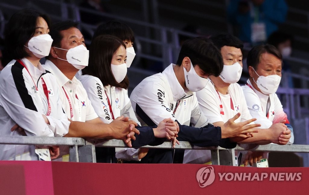 | ▲ South Korean taekwondo athletes and officials watch In Kyo-don in action during the quarterfinals of the men's +80kg taekwondo event at the Tokyo Olympics at Makuhari Messe Hall A in Chiba, Japan, on July 27, 2021. (Yonhap) |