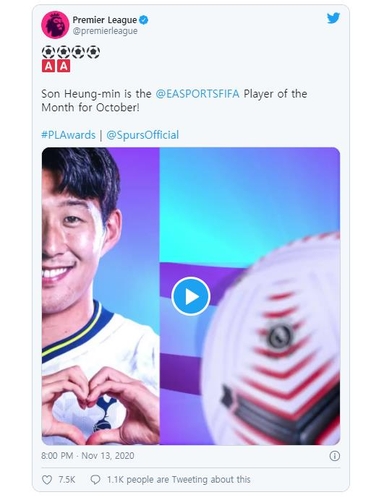 | ▲ 손흥민의 10월의 선수 수상 소식을 전한 프리미어리그. [프리미어리그 트위터. 재판매 및 DB 금지] |