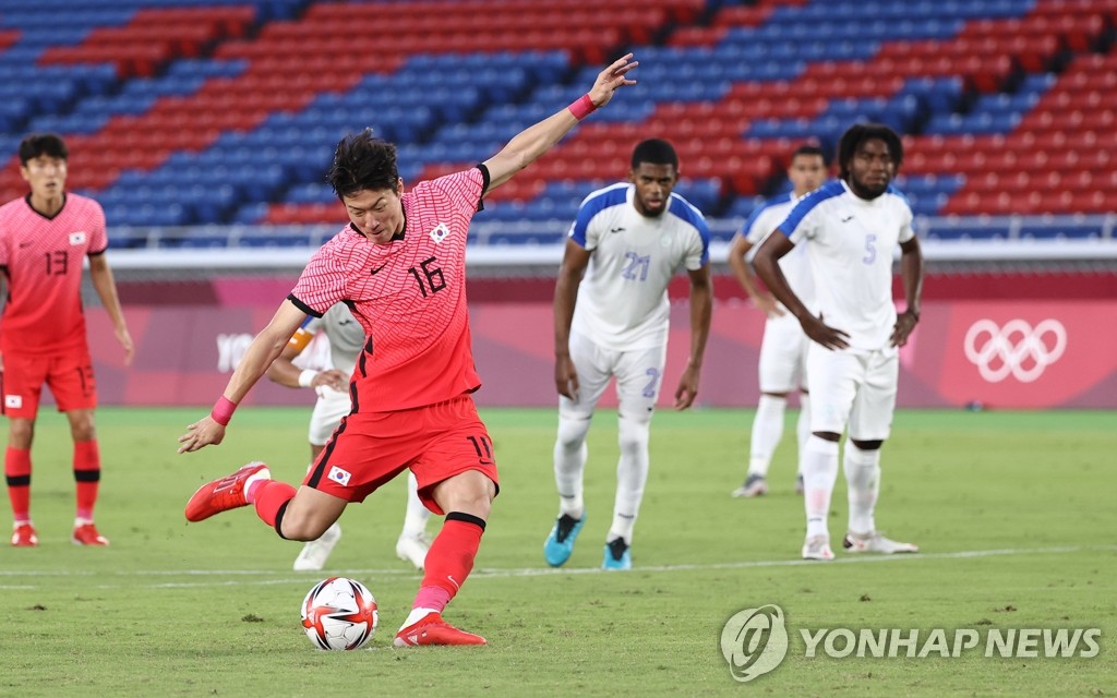 | ▲ Hwang Ui-jo of South Korea takes a penalty against Honduras during the teams' Group B match at the Tokyo Olympic men's football tournament at International Stadium Yokohama in Yokohama, Japan, on July 28, 2021. (Yonhap) |