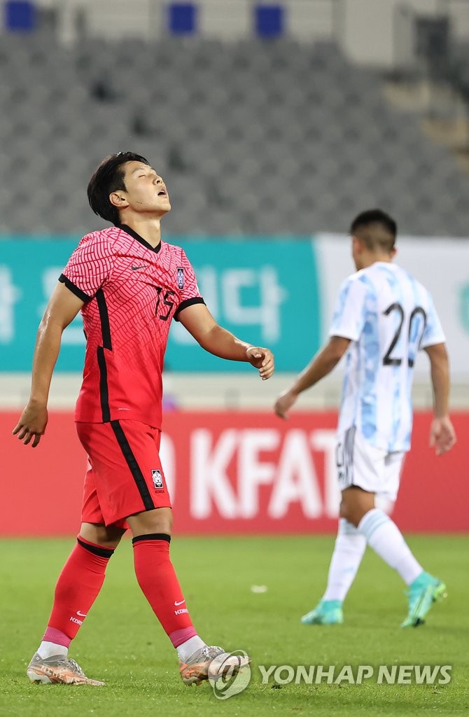 | ▲ Lee Kang-in of South Korea (L) reacts to a missed shot against Argentina in the teams' Olympic men's football tuneup match at Yongin Mireu Stadium in Yongin, 50 kilometers south of Seoul, on July 13, 2021. (Yonhap) |