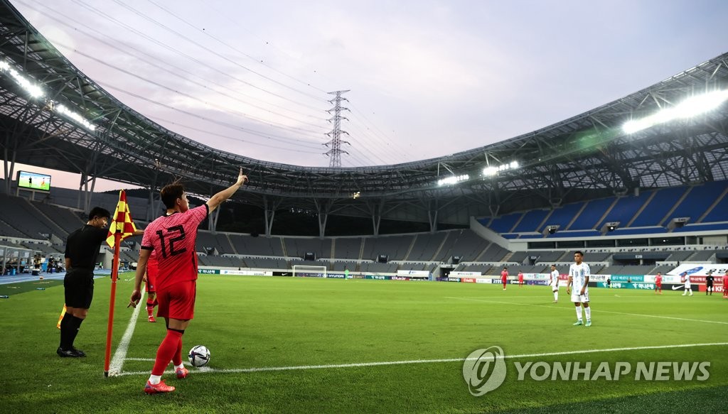 | ▲ Lee Dong-gyeong of South Korea prepares to take a corner against Argentina in the teams' Olympic men's football tuneup match at Yongin Mireu Stadium in Yongin, 50 kilometers south of Seoul, on July 13, 2021. (Yonhap) |