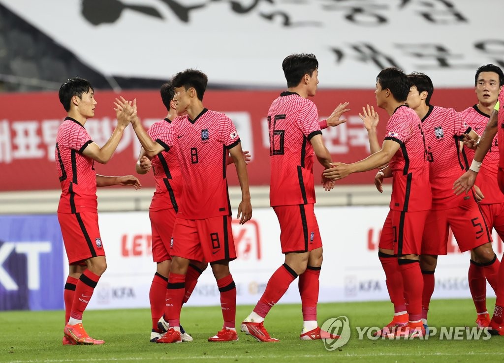 | ▲ South Korean players exchange high-fives after a 2-2 draw against Argentina in the teams' Olympic men's football tuneup match at Yongin Mireu Stadium in Yongin, 50 kilometers south of Seoul, on July 13, 2021. (Yonhap) |