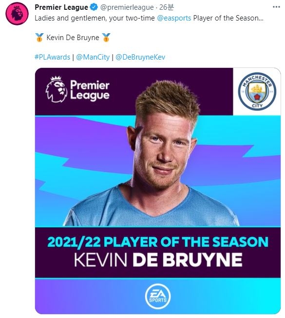 EPL 사무국은 21일 더브라위너가 2021-2022시즌 EPL 올해의 선수로 뽑혔다고 발표했다.