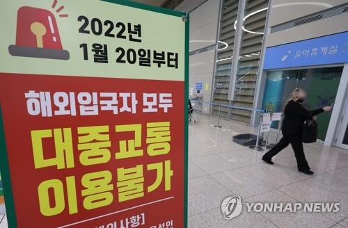 | ▲ A sign informing entrants from abroad of a ban on the use of public transportation starting Jan. 20, 2022, is set up in the arrival lobby of Incheon International Airport, west of Seoul, on the day. They are allowed to use quarantine buses, trains and taxis only as well as their own cars amid the spread of the omicron variant. (Yonhap) |