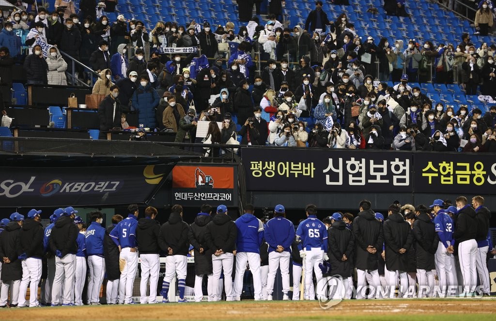 | ▲  Members of the Samsung Lions acknowledge their fans after losing to the Doosan Bears 11-3 in Game 2 of the second round in the Korea Baseball Organization postseason at Jamsil Baseball Stadium in Seoul on Nov. 10, 2021. (Yonhap) |