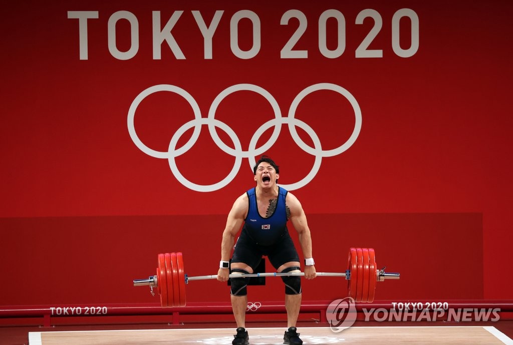 | ▲ Jin Yun-seong of South Korea attempts to lift 230kg in clean and jerk during the men's 109kg weightlifting event at the Tokyo Olympics at Tokyo International Forum in Tokyo on Aug. 3, 2021. (Yonhap) |