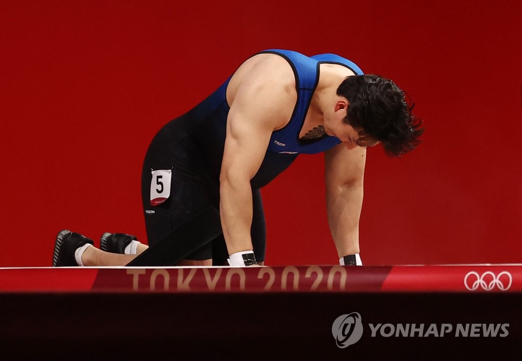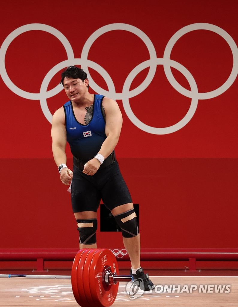 | ▲ Jin Yun-seong of South Korea reacts to a failed clean and jerk attempt during the men's 109kg weightlifting event at the Tokyo Olympics at Tokyo International Forum in Tokyo on Aug. 3, 2021. (Yonhap) |