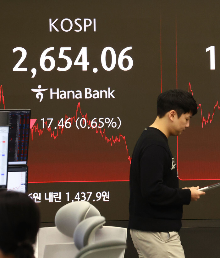 A financial data screen in the dealing room of Hana Bank in Seoul on Feb. 20, 2025, shows the benchmark Korea Composite Stock Price Index having fallen 17.46 points, or 0.65 percent, to close at 2,654.06. Seoul shares closed lower after Trump's comments on tariffs and the Federal Reserve's cautious stance on rate cuts. (Yonhap)