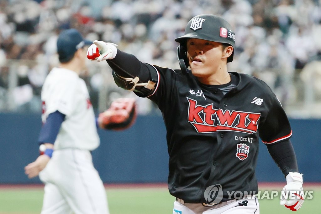 | ▲  Cho Yong-ho of the KT Wiz celebrates his RBI single against the Doosan Bears in the top of the seventh inning in Game 3 of the Korean Series at Gocheok Sky Dome in Seoul on Nov. 17, 2021. (Yonhap) |