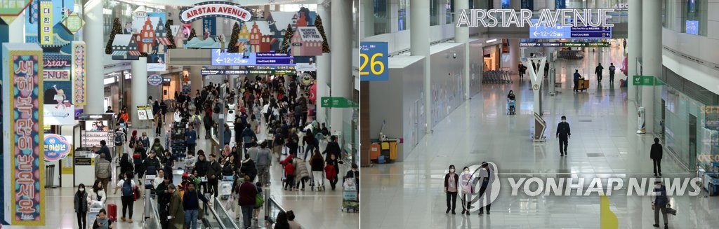 | ▲ These composite file photos, taken Jan. 21, 2020 (L), and Jan. 21, 2022, show the duty-free shop area of the No. 1 Terminal at the Incheon International Airport to compare the number of passengers. (Yonhap) |