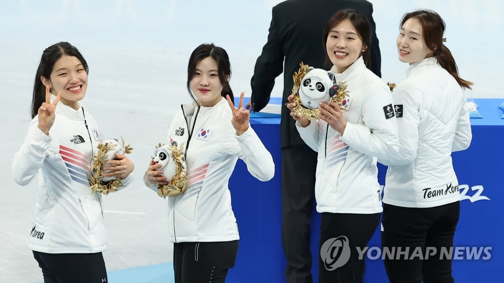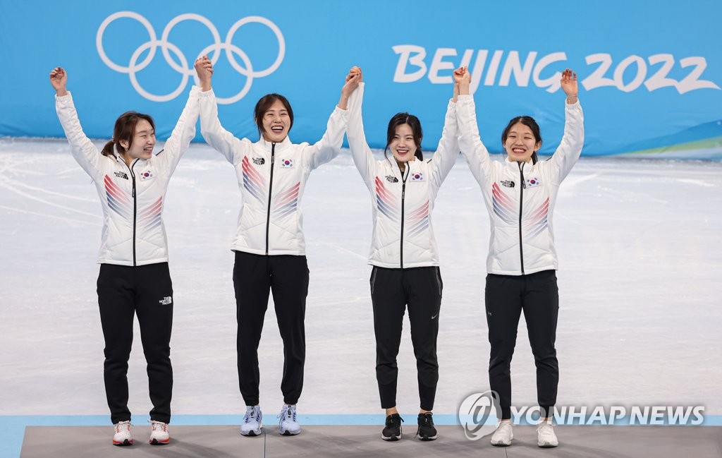 | ▲ South Korean short track speed skaters Seo Whi-min, Lee Yu-bin, Kim A-lang and Choi Min-jeong (L to R) celebrate their silver medal in the women's 3,000m relay at the Beijing Winter Olympics at Capital Indoor Stadium in Beijing on Feb. 13, 2022. (Yonhap) |