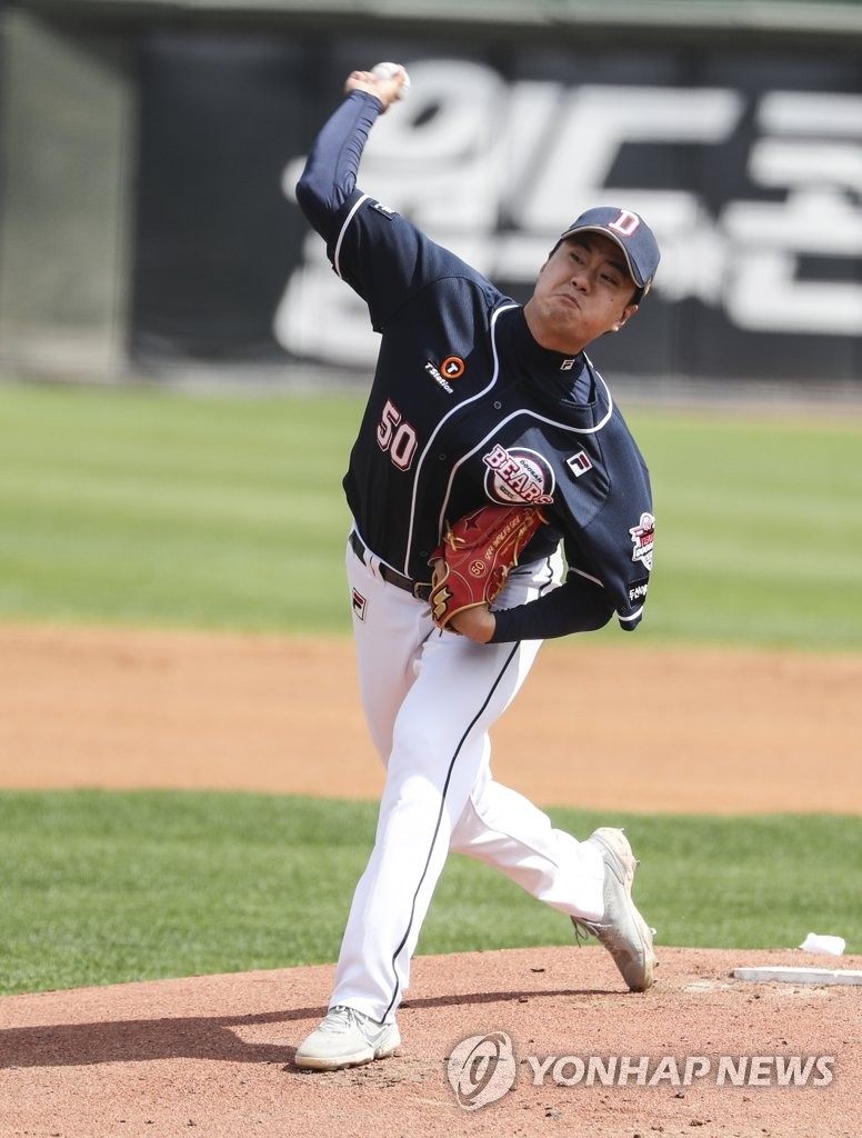 | ▲ In this file photo from April 10, 2022, Lee Young-ha of the Doosan Bears pitches against the Lotte Giants during the bottom of the first inning of a Korea Baseball Organization regular season game at Sajik Stadium in Busan, 450 kilometers southeast of Seoul. (Yonhap) |