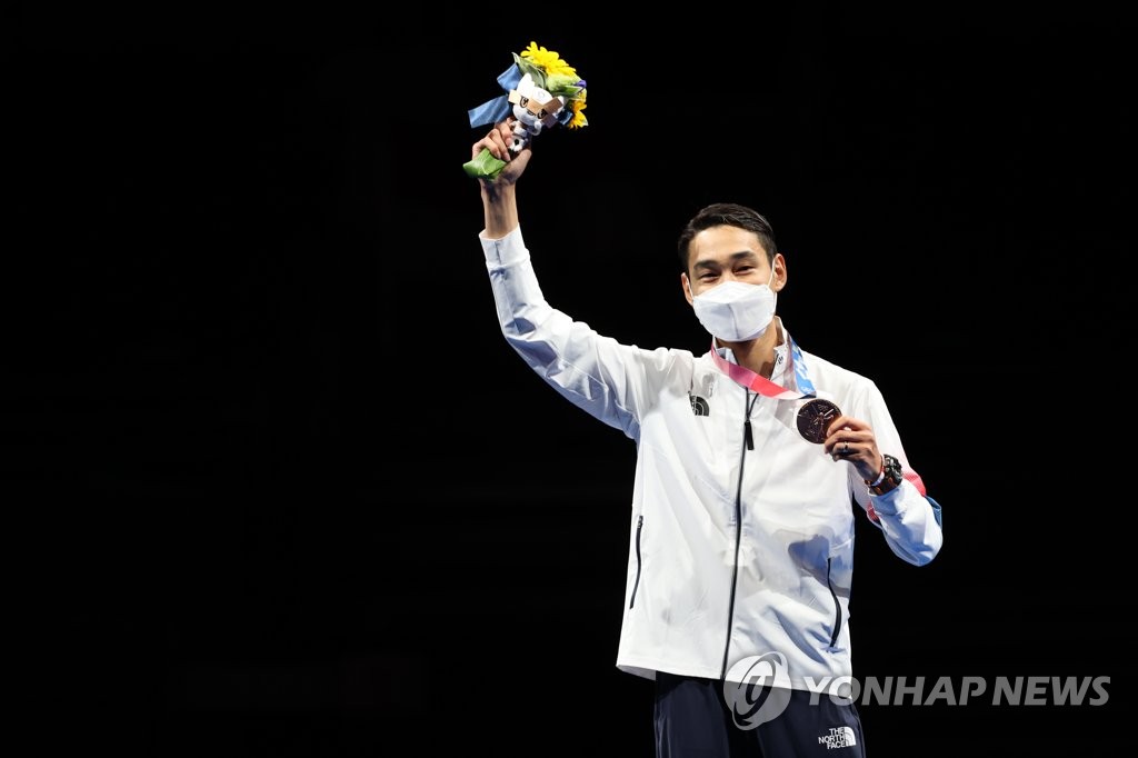| ▲ Kim Jung-hwan of South Korea holds up his bronze medal from the men's individual sabre event at the Tokyo Olympics at Makuhari Messe Hall B in Chiba, Japan, on July 24, 2021. (Yonhap) |