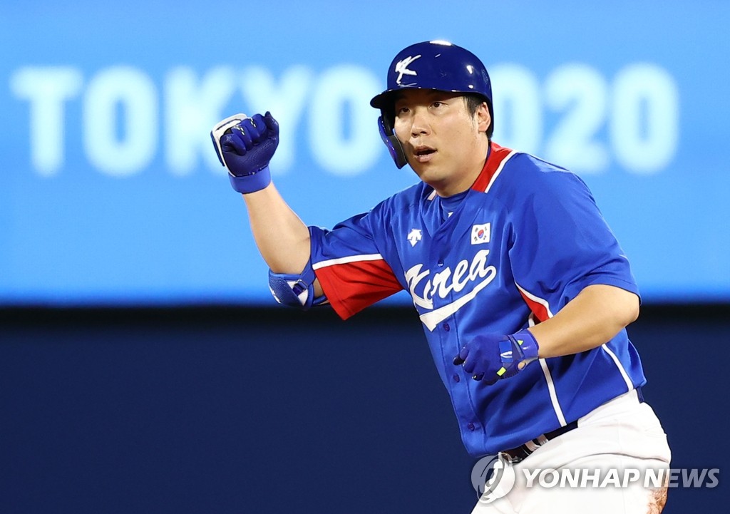 | ▲  Kim Hyun-soo of South Korea celebrates his double against Japan in the top of the eighth inning in the semifinals of the Tokyo Olympic baseball tournament at Yokohama Stadium in Yokohama, Japan, on Aug. 4, 2021. (Yonhap) |