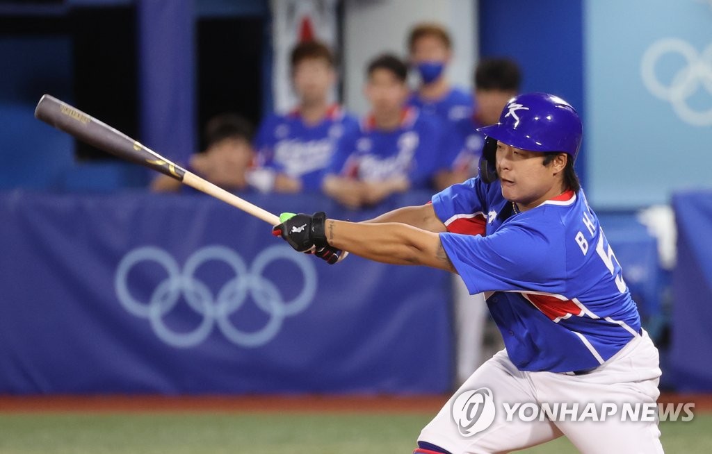 | ▲  Kang Baek-ho of South Korea hits a single against Japan in the top of the sixth inning in the semifinals of the Tokyo Olympic baseball tournament at Yokohama Stadium in Yokohama, Japan, on Aug. 4, 2021. (Yonhap) |
