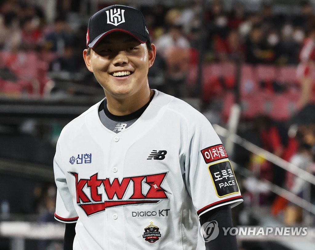 | ▲ KT Wiz starter So Hyeong-jun smiles after pitching out of a bases-loaded jam against the Kia Tigers in the top of the fourth inning of a Korea Baseball Organization wild card game at KT Wiz Park in Suwon, 35 kilometers south of Seoul, on Oct. 13, 2022. (Yonhap) |