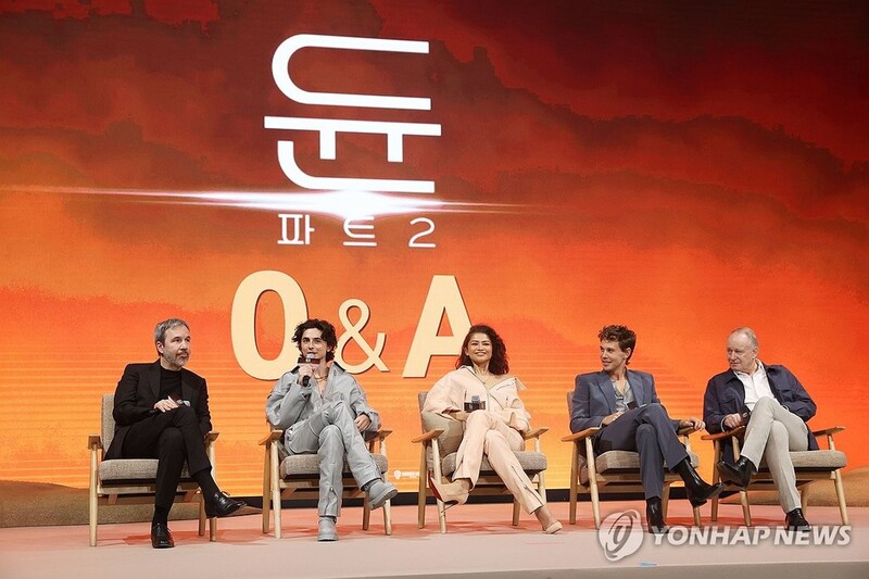 | ▲ 영화 '듄: 파트2' 내한 기자간담회 (서울=연합뉴스) 강민지 기자 = 21일 오후 서울 영등포구 콘래드호텔에서 열린 영화 '듄: 파트2' 내한 기자간담회가 열리고 있다. 왼쪽부터 드니 빌뇌브 감독, 티모테 샬라메, 젠데이아, 오스틴 버틀러, 스텔란 스카스가드. 2024.2.21 mjkang@yna.co.kr |