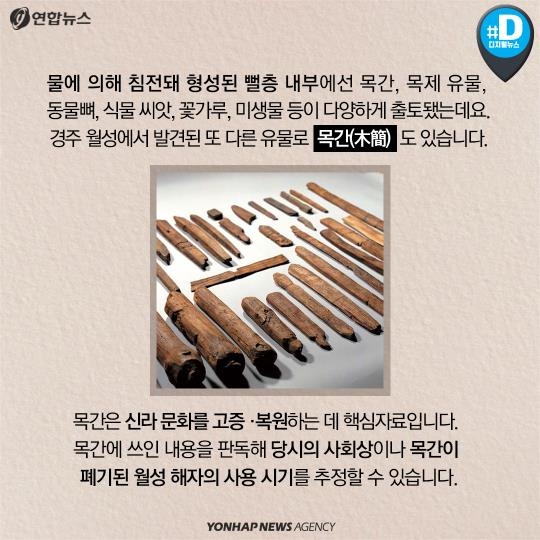 물에 의해 침전돼 형성된 뻘층 내부에선 목간, 목제 유물, 동물 뼈, 식물 씨앗, 꽃가루, 미생물 등이 다양하게 출토됐는데요.