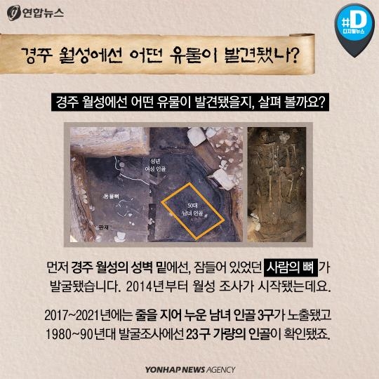 먼저 경주 월성의 성벽 밑에선, 잠들어 있었던 사람의 뼈가 발굴됐습니다. 2014년부터 월성 조사가 시작됐는데요.