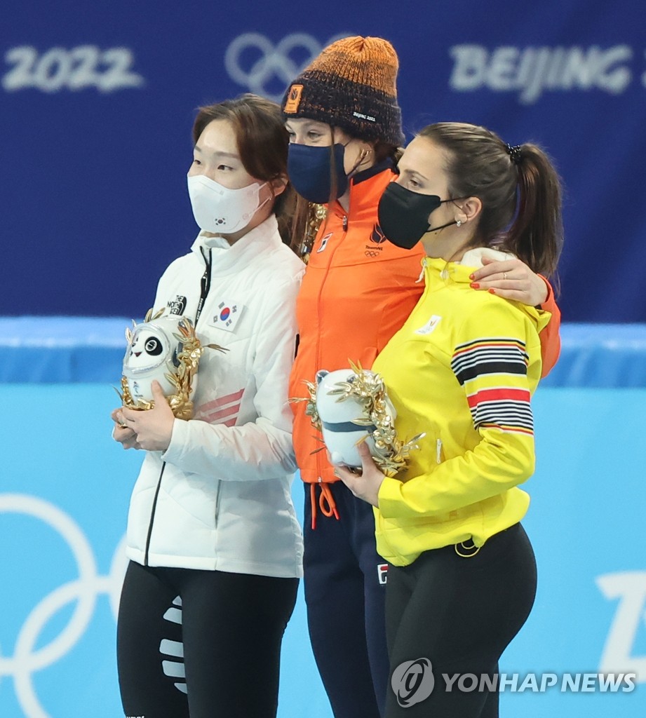 | ▲  Choi Min-jeong of South Korea (L) poses with other medalists after winning silver in the women's 1,000m short track speed skating race at the Beijing Winter Olympics at Capital Indoor Stadium in Beijing on Feb. 11, 2022. At center is the gold medalist, Suzanne Schulting of the Netherlands, with the bronze medalist, Hanne Desmet of Belgium, to her left. (Yonhap) |