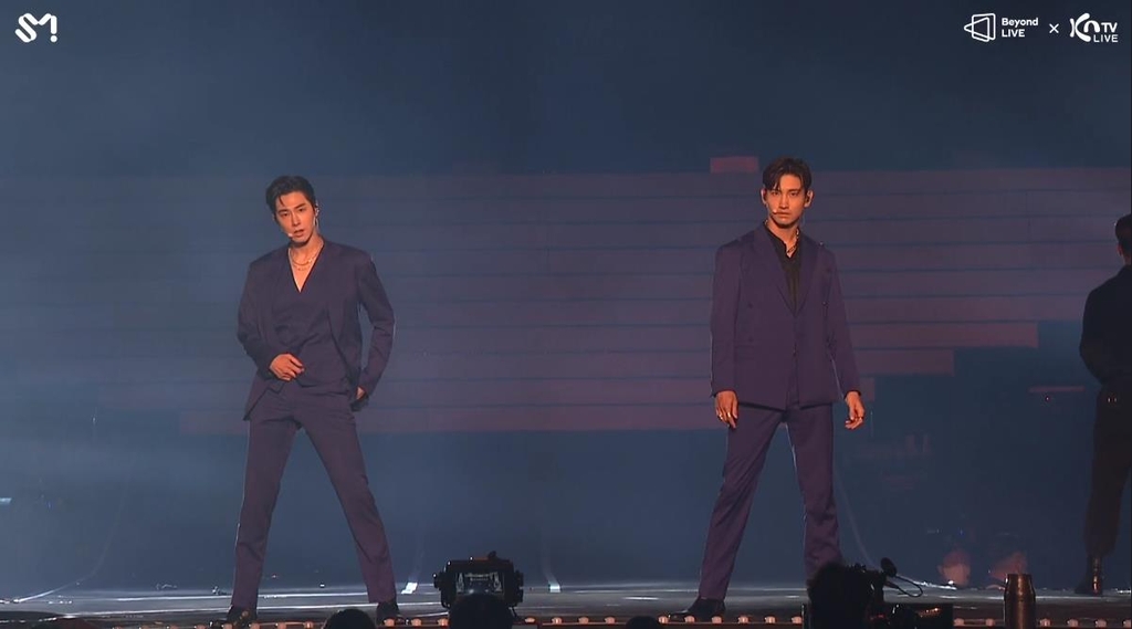 | ▲ SM타운 콘서트에서 무대를 꾸미는 그룹 동방신기 [SM타운 콘서트 캡처.] |