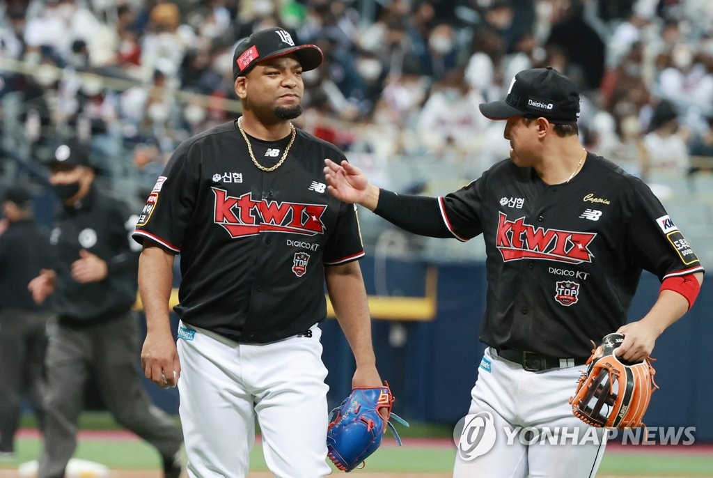 | ▲  KT Wiz starter Odrisamer Despaigne (L) is congratulated by third baseman Hwang Jae-gyun after completing the bottom of the fifth inning of Game 3 of the Korean Series against the Doosan Bears at Gocheok Sky Dome in Seoul on Nov. 17, 2021. (Yonhap) |