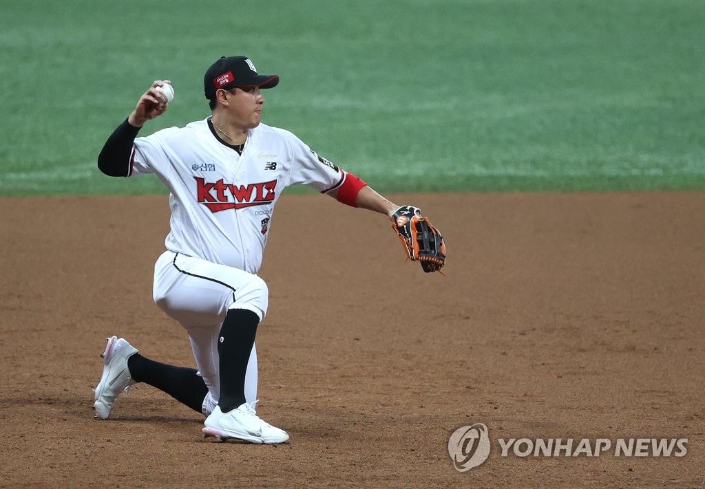 | ▲  KT Wiz second baseman Park Kyung-su makes a throw to first against the Doosan Bears in the bottom of the eighth inning during Game 3 of the Korean Series at Gocheok Sky Dome in Seoul on Nov. 17, 2021. (Yonhap) |