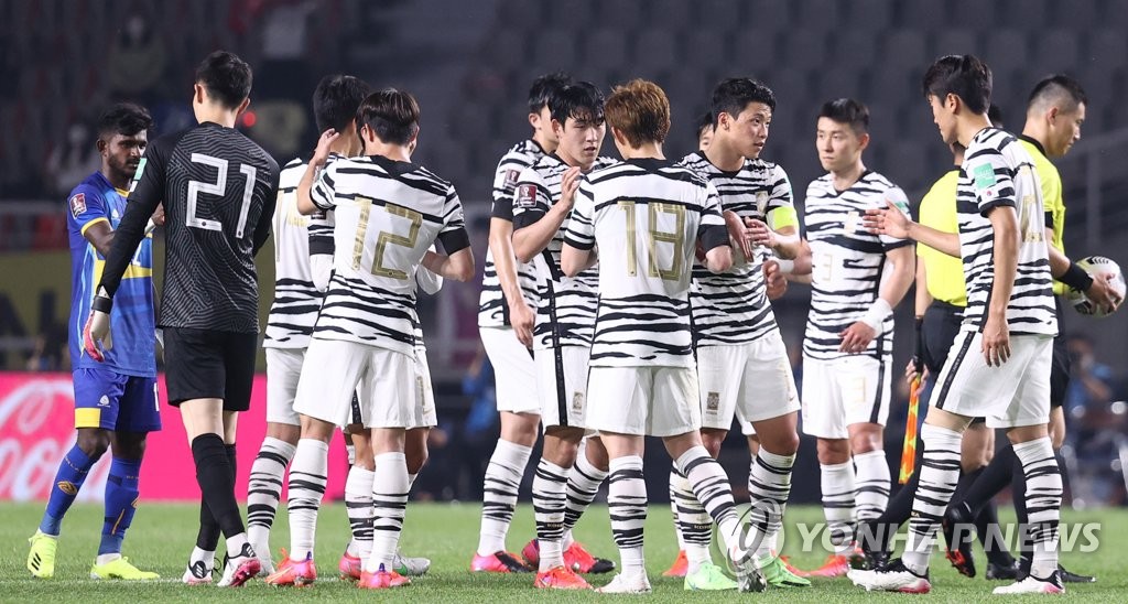 ▲ South Korean players (in white) celebrate their 5-0 win over Sri Lanka during the teams' Group H match in the second round of the Asian qualification for the 2022 FIFA World Cup at Goyang Stadium in Goyang, Gyeonggi Province, on June 9, 2021. (Yonhap)