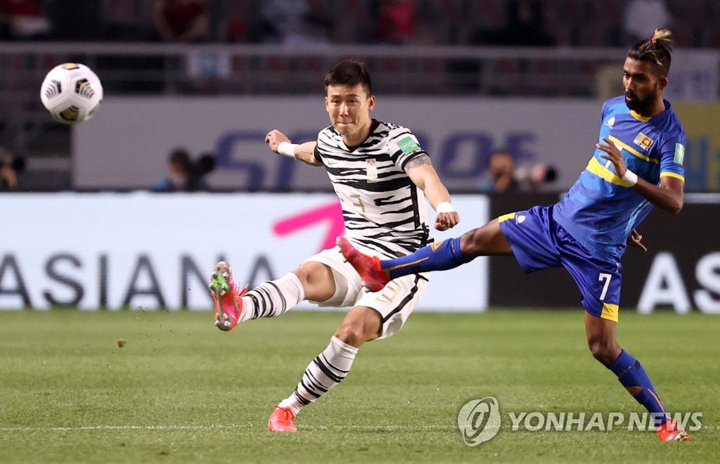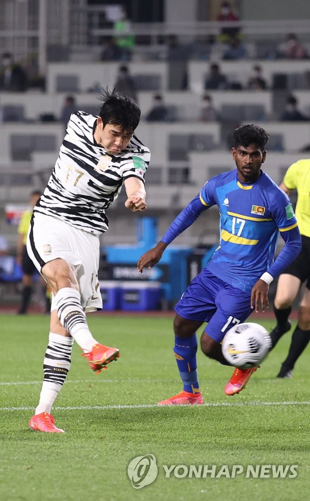 ▲ Song Min-kyu of South Korea (L) takes a shot against Sri Lanka during the teams' Group H match in the second round of the Asian qualification for the 2022 FIFA World Cup at Goyang Stadium in Goyang, Gyeonggi Province, on June 9, 2021. (Yonhap)