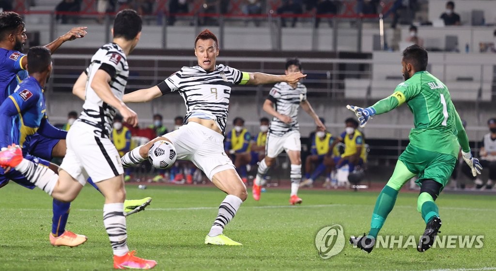 SEOUL, June 9 (Yonhap) -- Forward Kim Shin-wook had a brace and teen sensation Jeong Sang-bin scored in his international debut, helping South Korea beat up on Sri Lanka 5-0 in a World Cup qualifying match at home on Wednesday.