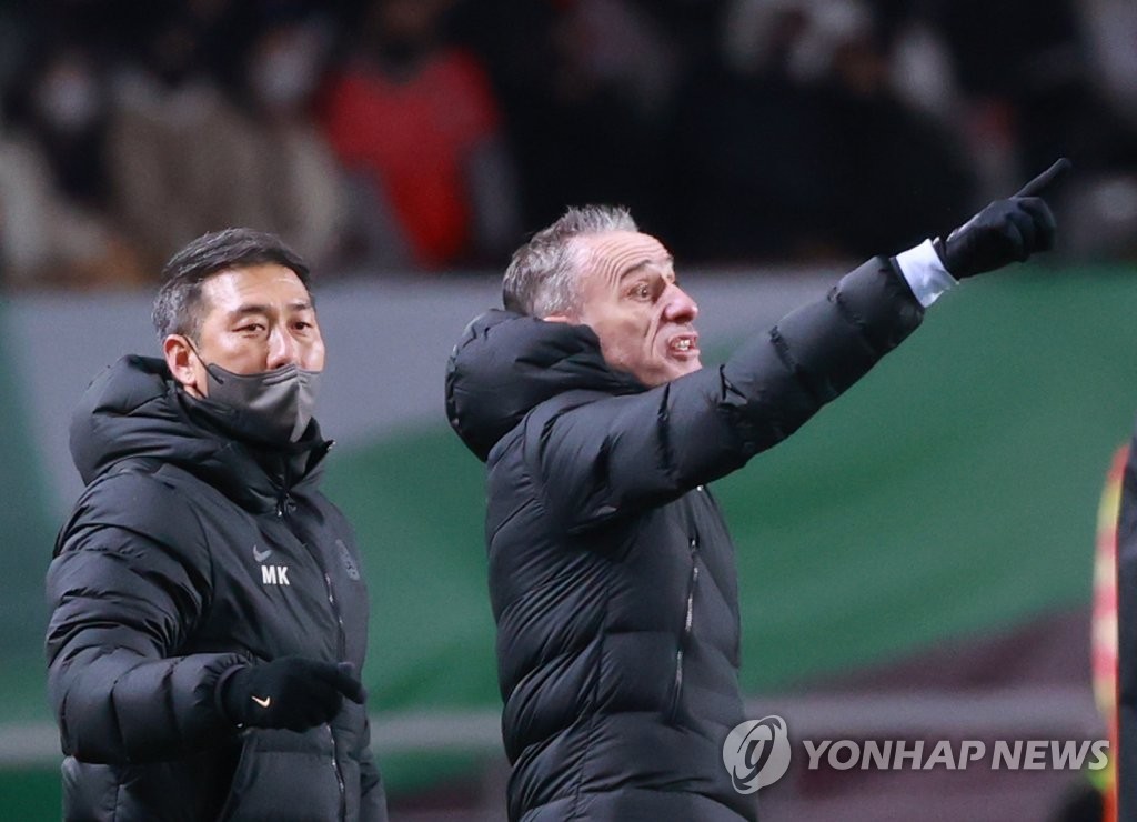 | ▲ South Korea head coach Paulo Bento (R) directs his players against the United Arab Emirates during the teams' Group A match in the final Asian qualifying round for the 2022 FIFA World Cup at Goyang Stadium in Goyang, Gyeonggi Province, on Nov. 11, 2021. (Yonhap) |