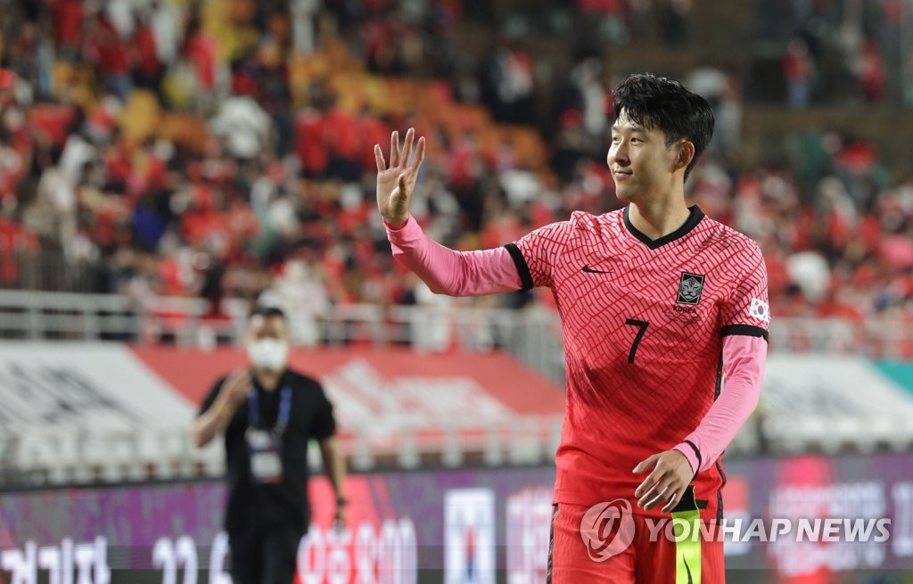| ▲  Son Heung-min of South Korea salutes the crowd at Suwon World Cup Stadium in Suwon, 35 kilometers south of Seoul, after a 2-2 draw against Paraguay in the countries' friendly football match on June 10, 2022. (Yonhap) |
