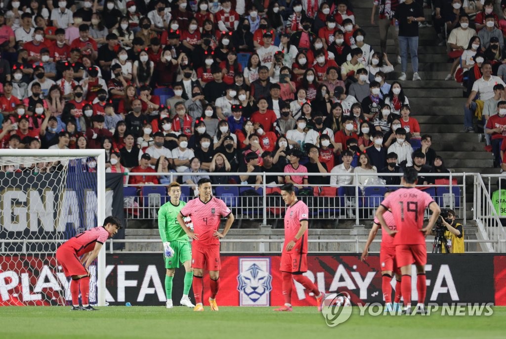| ▲  South Korean players react to a goal by Paraguay during the countries' friendly football match at Suwon World Cup Stadium in Suwon, 35 kilometers south of Seoul, on June 10, 2022. (Yonhap) |
