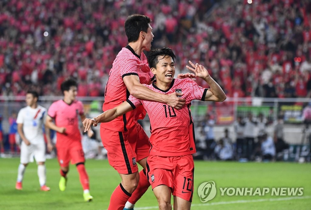 | ▲  Jeong Woo-yeong of South Korea (R) celebrates his goal against Paraguay during the countries' friendly football match at Suwon World Cup Stadium in Suwon, 35 kilometers south of Seoul, on June 10, 2022. (Yonhap) |