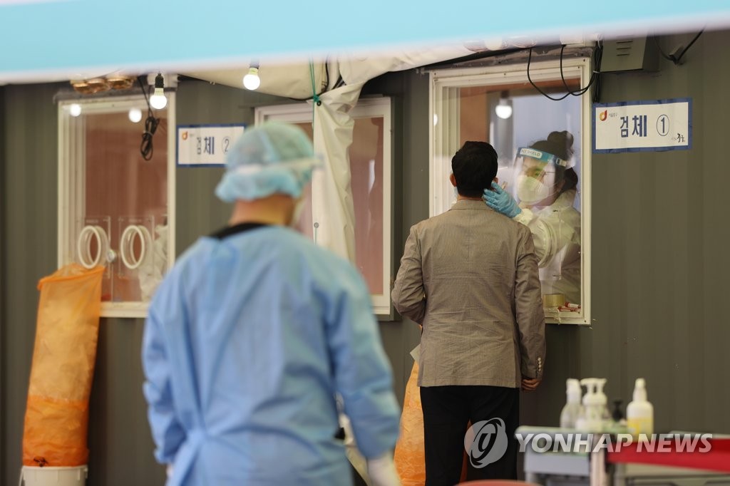 | ▲ Visitors receive COVID-19 tests at a makeshift clinic in central Seoul on April 9, 2021. (Yonhap) |