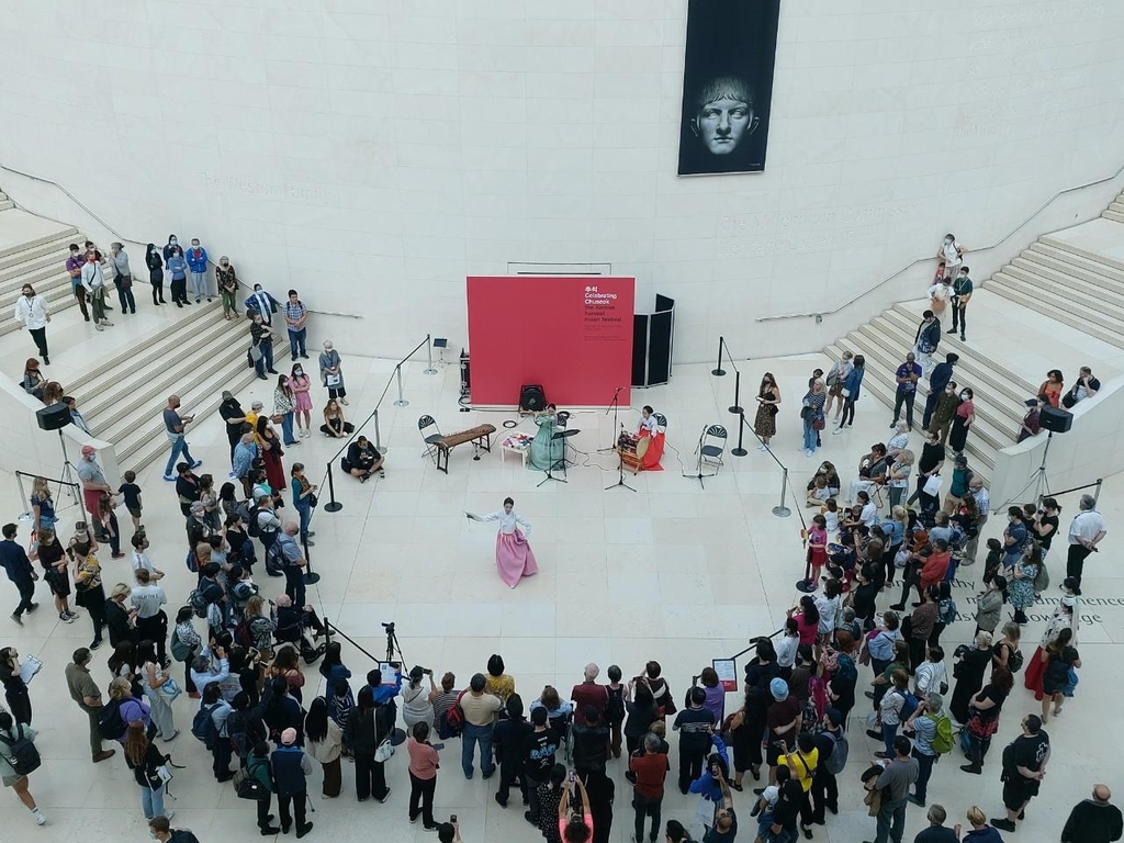 추석 전 주말인 지난 18일(현지시간) 영국박물관 입구 로비인 '그레이트 코트'에서 가야금 연주, 사물놀이, 전통무용 등의 공연이 펼쳐졌고 관객들도 함께 아리랑을 불렀다.