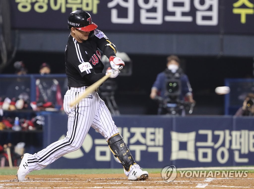 Two innings later, Kim again fell behind 0-1 in the count against Gwak after whiffing on a curveball. Gwak then threw him a fastball, and Kim drilled it to left field to put the Twins up 2-0.