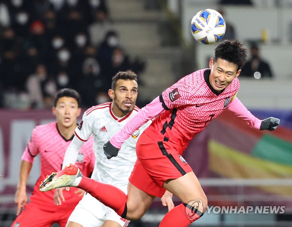 | ▲ Son Heung-min of South Korea (R) attempts a header against the United Arab Emirates during the teams' Group A match in the final Asian qualifying round for the 2022 FIFA World Cup at Goyang Stadium in Goyang, Gyeonggi Province, on Nov. 11, 2021. (Yonhap) |