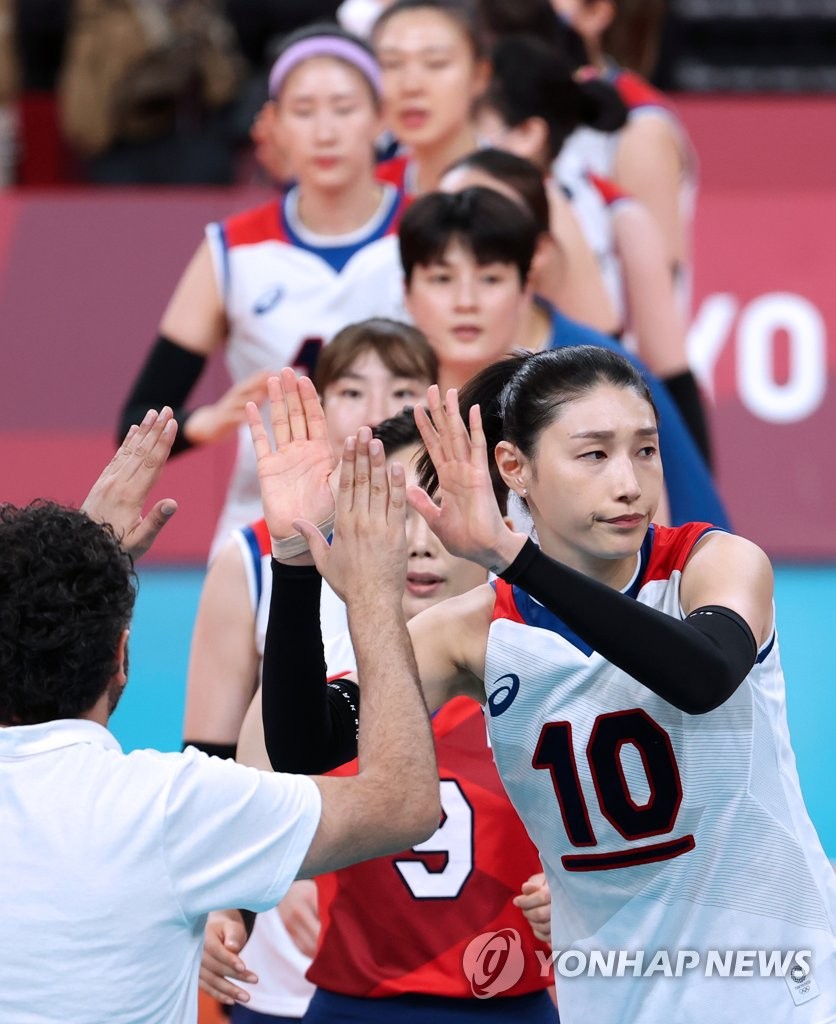 | ▲ South Korean players and coaches high-five each other after their straight-set loss to Brazil in the semifinals of the Tokyo Olympic women's volleyball tournament at Ariake Arena in Tokyo on Aug. 6, 2021. (Yonhap) |
