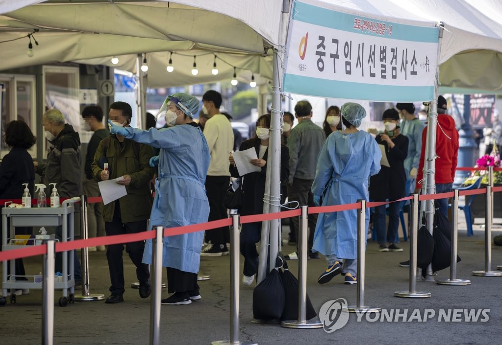 | ▲ People stand in line to receive coronavirus tests at a makeshift clinic in front of Seoul Station on May 3, 2021. (Yonhap) |