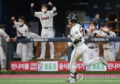 | ▲ 김재호, '역전이다' (서울=연합뉴스) 이정훈 기자 = 20일 오후 서울 구로구 고척스카이돔에서 열린 2020 프로야구 포스트시즌 한국시리즈(KS) 3차전 두산 베어스와 NC 다이노스의 경기. 7회말 1사 1, 3루 두산 김재호가 1타점 역전 적시타를 때린 뒤 1루로 향하고 있다. 2020.11.20 uwg806@yna.co.kr |
