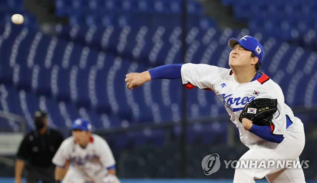 | ▲ Cho Sang-woo of South Korea pitches against Israel in the top of the seventh inning of the teams' Group B game in the Tokyo Olympic baseball tournament at Yokohama Stadium in Yokohama, Japan, on July 29, 2021. (Yonhap) |