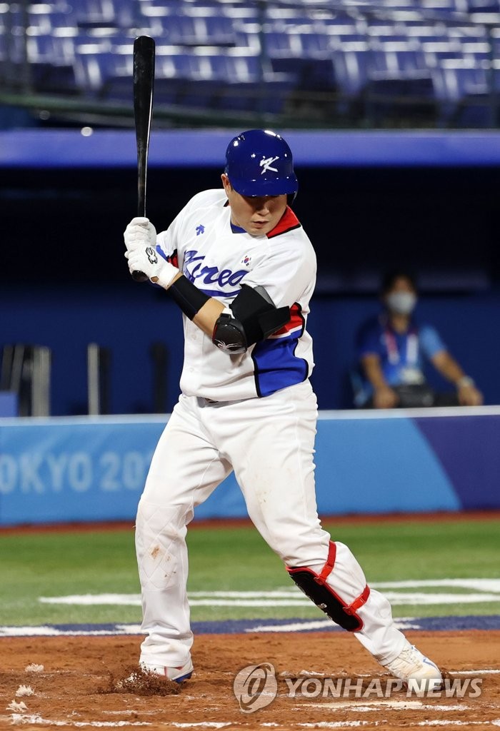 | ▲ Yang Eui-ji of South Korea gets hit by a pitch from Jeremy Bleich of Israel in the bottom of the 10th inning of the teams' Group B game in the Tokyo Olympic baseball tournament at Yokohama Stadium in Yokohama, Japan, on July 29, 2021. (Yonhap) |