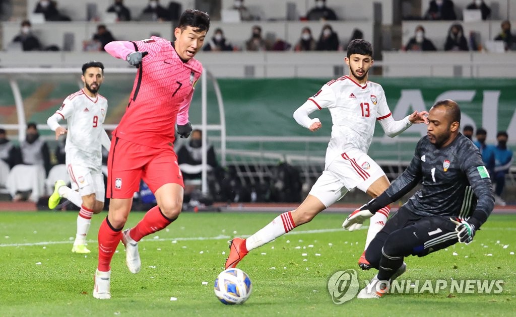 ▲ Son Heung-min of South Korea (L) attempts a shot against the United Arab Emirates during the teams' Group A match in the final Asian qualifying round for the 2022 FIFA World Cup at Goyang Stadium in Goyang, Gyeonggi Province, on Nov. 11, 2021. (Yonhap)