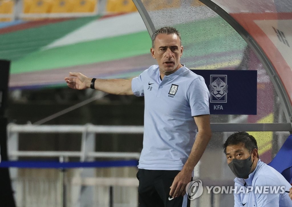 | ▲ South Korea head coach Paulo Bento (L) speaks with his assistant coaches during his team's Group A match against Lebanon in the final Asian qualifying round for the 2022 FIFA World Cup at Suwon World Cup Stadium in Suwon, Gyeonggi Province, on Sept. 7, 2021. (Yonhap) |