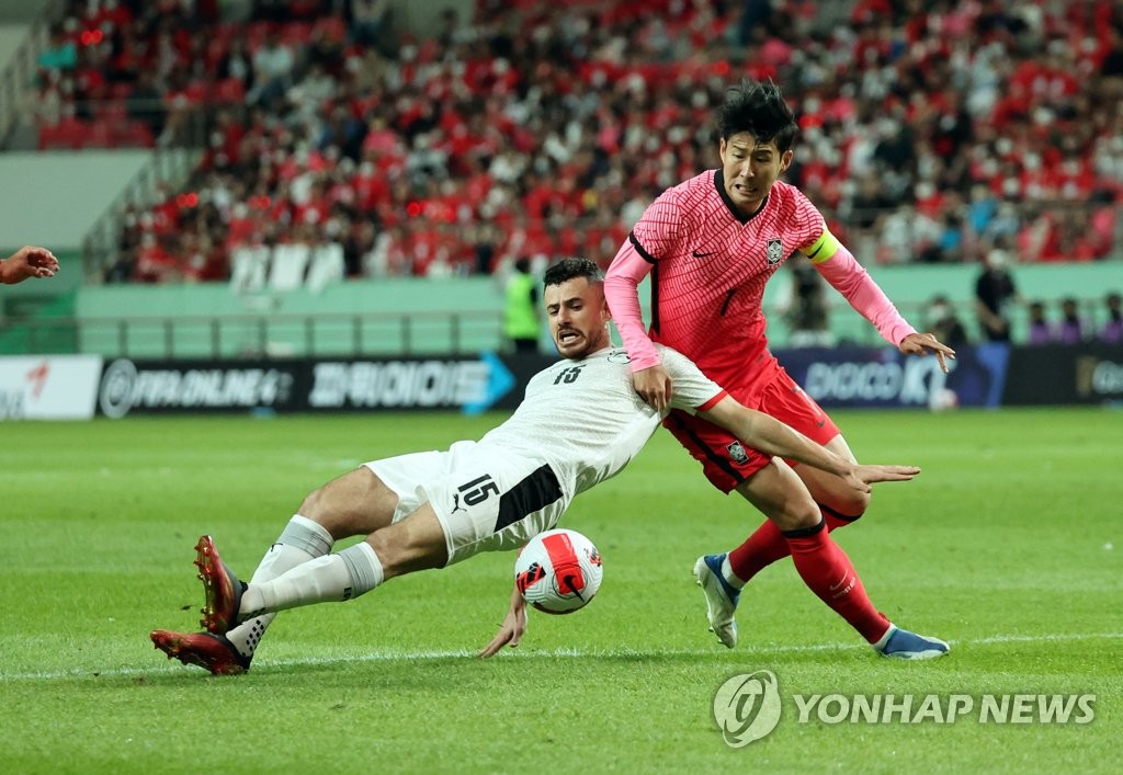 | ▲  Son Heung-min of South Korea (R) tries to get past Mahmoud Hamdy of Egypt during the countries' friendly football match at Seoul World Cup Stadium in Seoul on June 14, 2022. (Yonhap) |