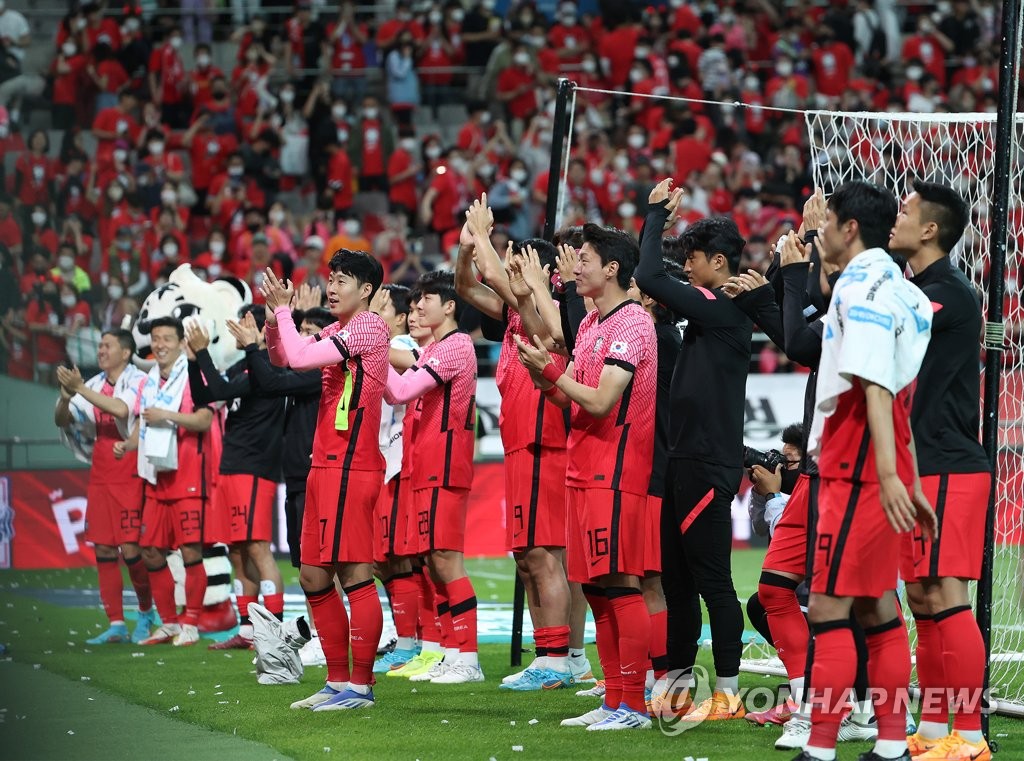 | ▲  South Korean players salute their fans after beating Egypt 4-1 in the countries' friendly football match at Seoul World Cup Stadium in Seoul on June 14, 2022. (Yonhap) |