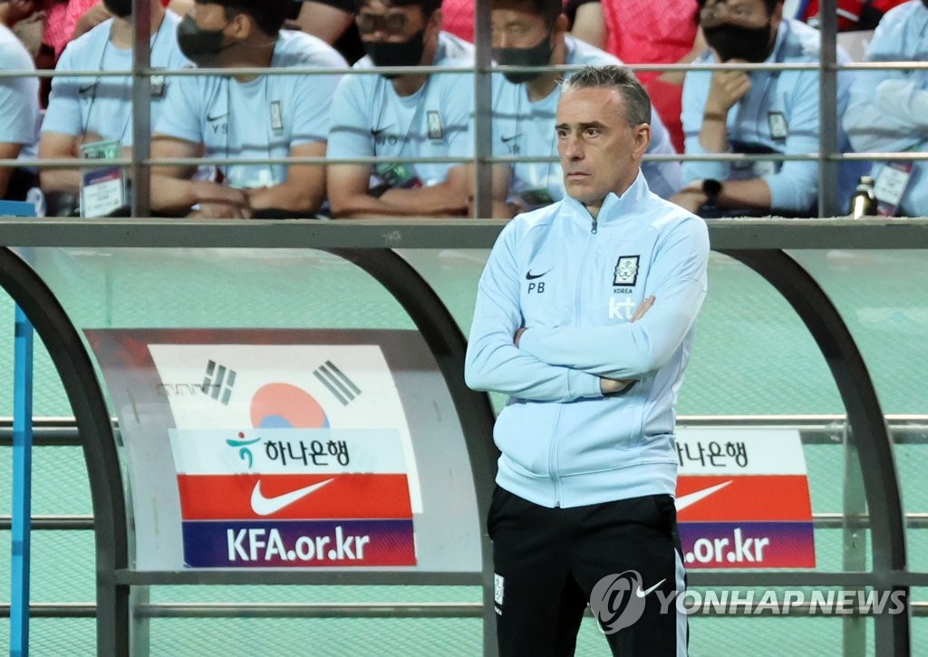 | ▲  South Korea head coach Paulo Bento watches his team in action against Egypt during a friendly football match at Seoul World Cup Stadium in Seoul on June 14, 2022. (Yonhap) |